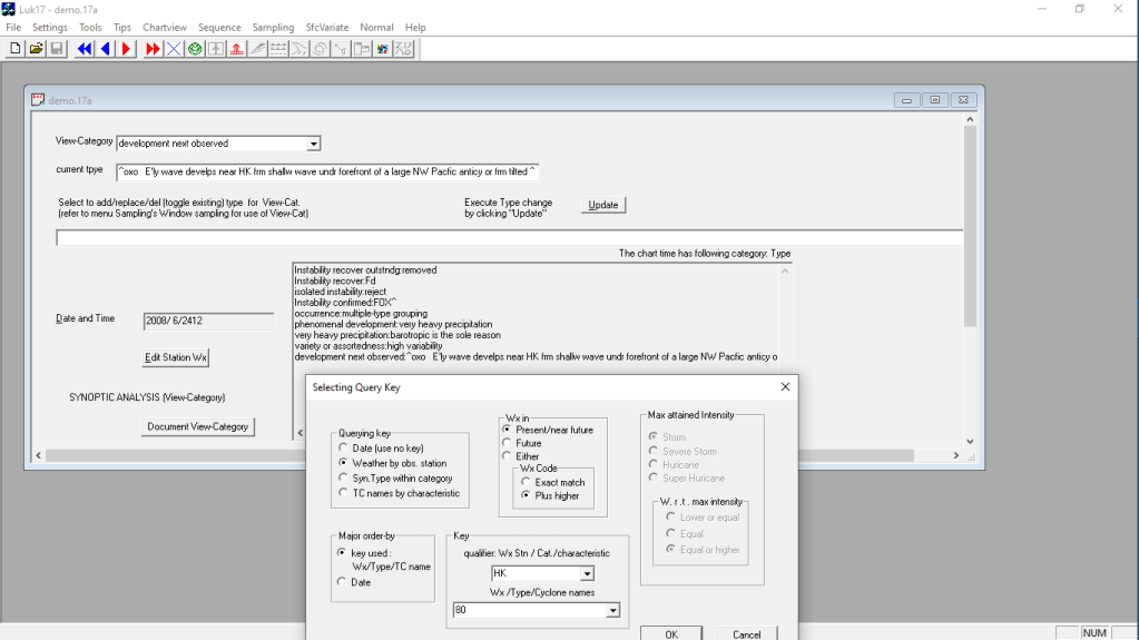 However the most useful application for this program lies in the weather study on extreme rainstorm occurrences in Hong Kong. It is started by defining one or more(maximun unlimited) categories(meaning any subject of interest) and under each of which any number of types such as detailed occurrences or observations. Appropriate type within the category would be selected and assigned to the date-times(as a unit record) in the database . For example, 12-hourly rainfall can treated as category and under it intensities extreme, heavy, moderate, light or zero(default by not assigned) as types for assignment to any date-time record. Each master screen display shows the current record’s date time. Selections from the two edit boxes’s dropdowns can be assigned the current record’s category-type attribute. Once this is done, the same record can be retrieved from the database later at any time through a sampling process done on a specification dialogue box. For example, if radio button ‘synoptic type within category’ is clicked, the category ‘next development observed’ will show up in the dialogue box’s upper edit box’s dropdown, and various behavior types will appear in the lower edit box dropdown for selection to execute the relevant date-time record retrieval.